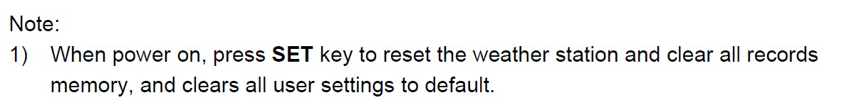 1) When power on, press SET key to reset the weather station and clear all records