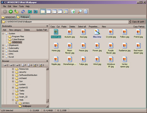 CubicExplorer is a file manager/browser software. It's designed to be easy to use yet powerful to handle multiple directories at the same time. It uses tabbed browsing and bookmarks. It also has a build-in text editor which has highlighters for many different file types.